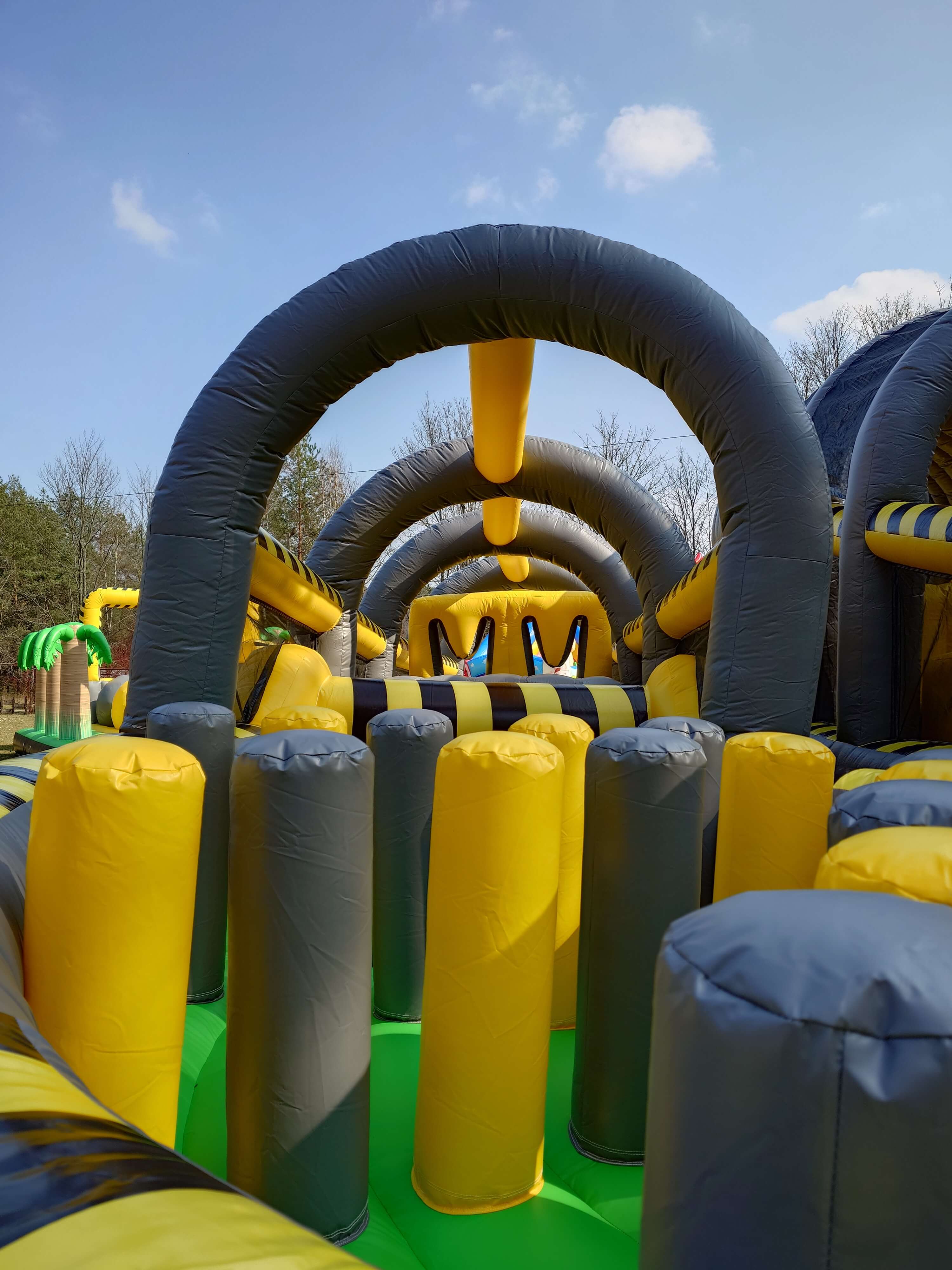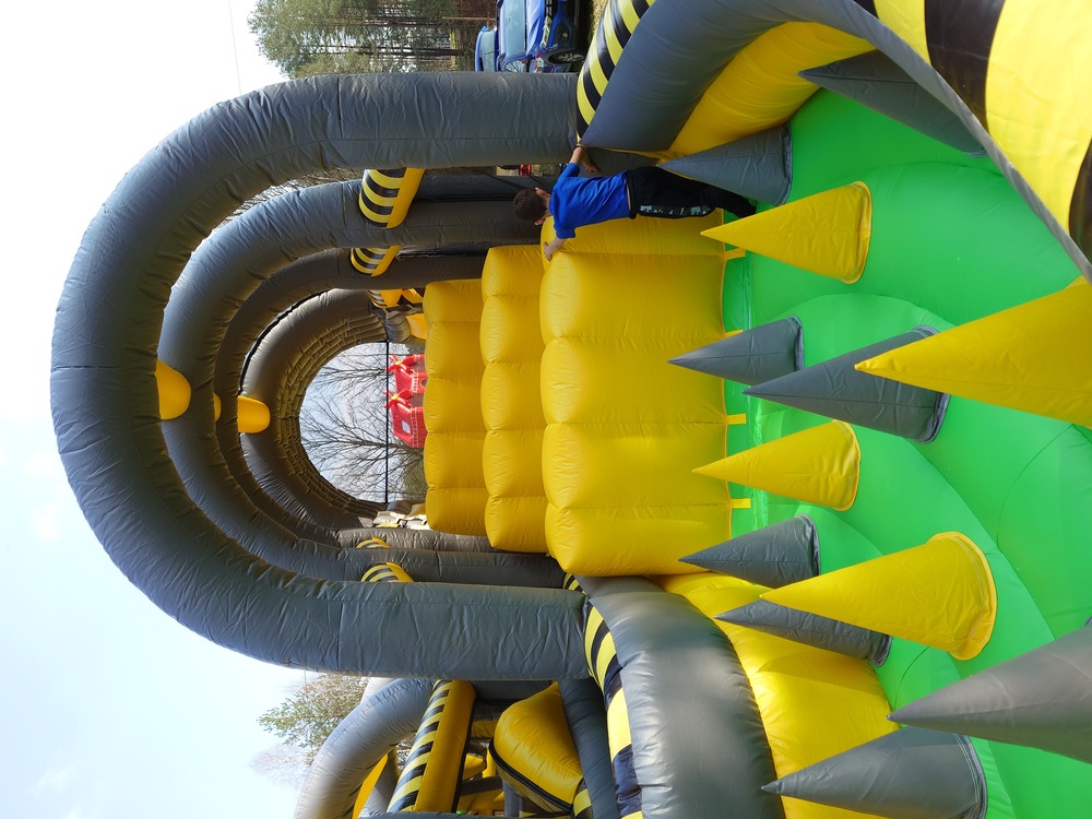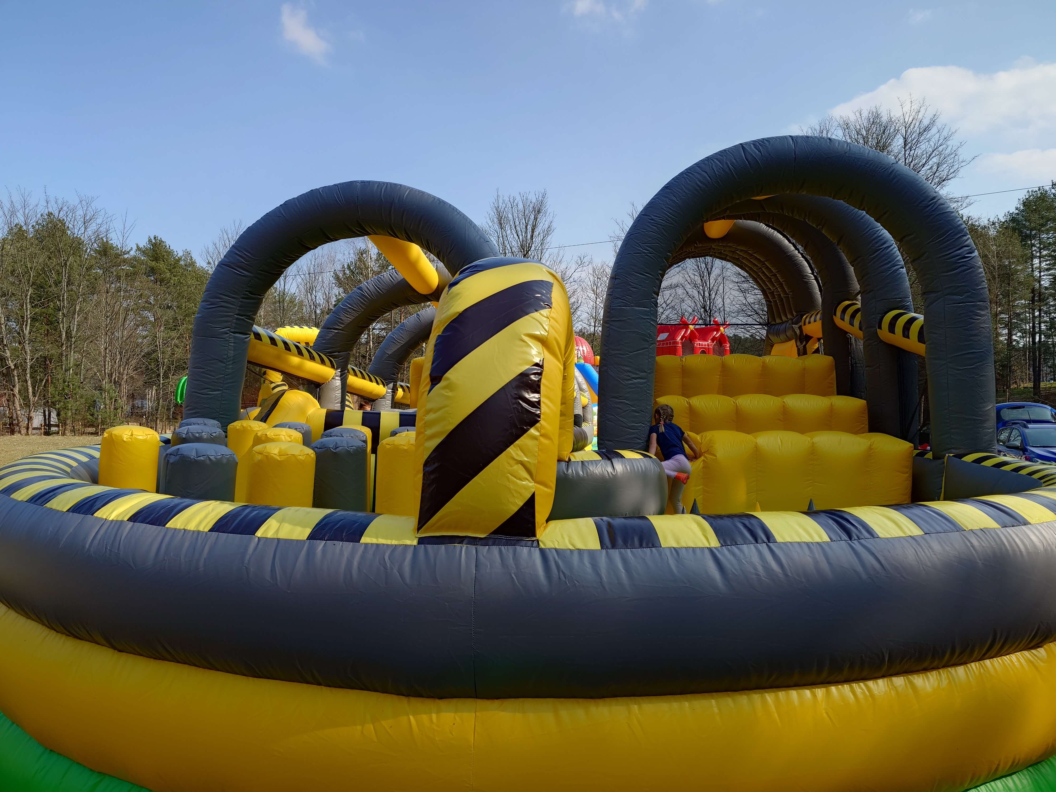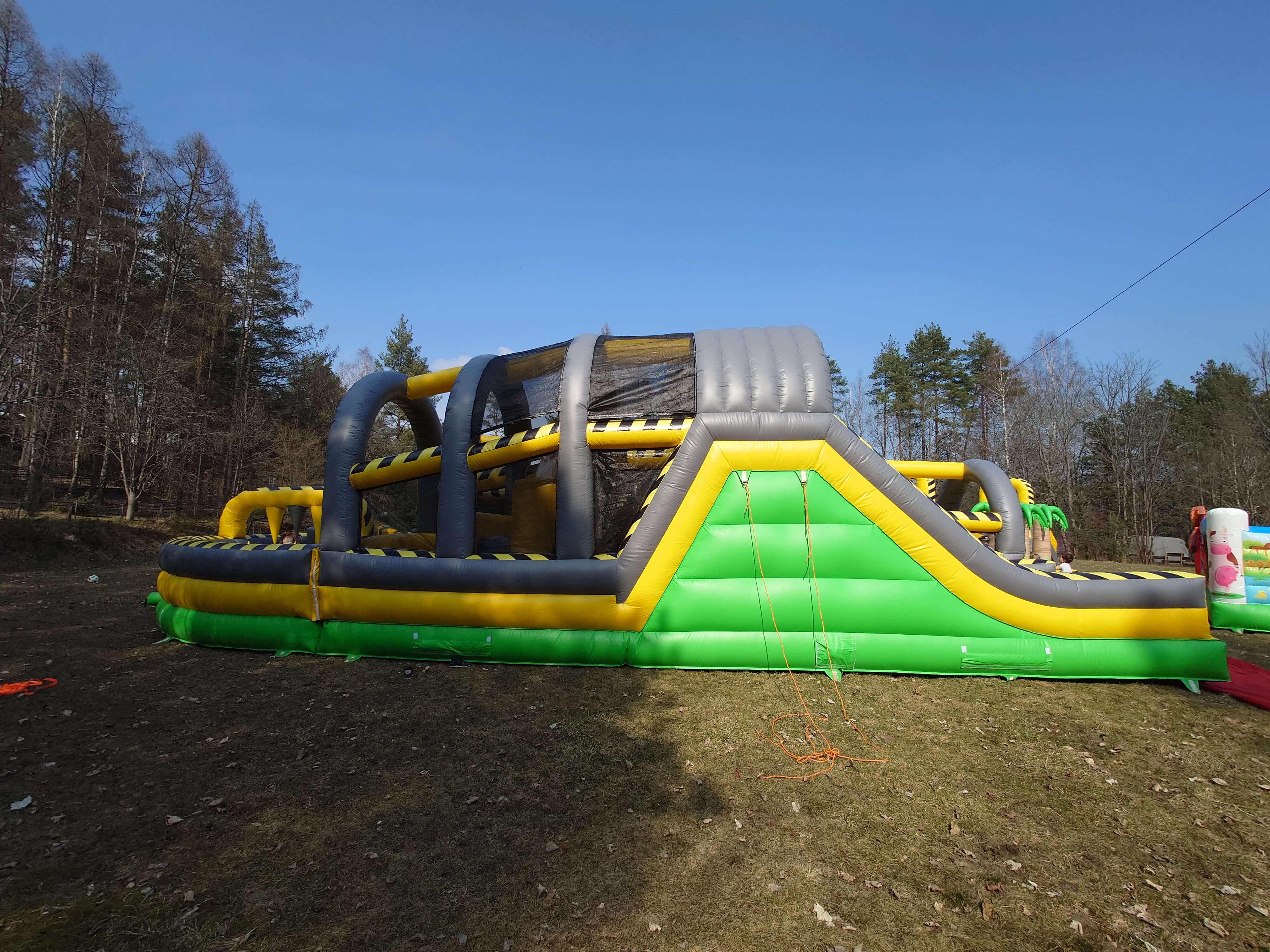4. Zawiera m.in.: stojące dmuchane słupki, ściankę wspinaczkową, kule/beczki do skakania, zjeżdżalnię