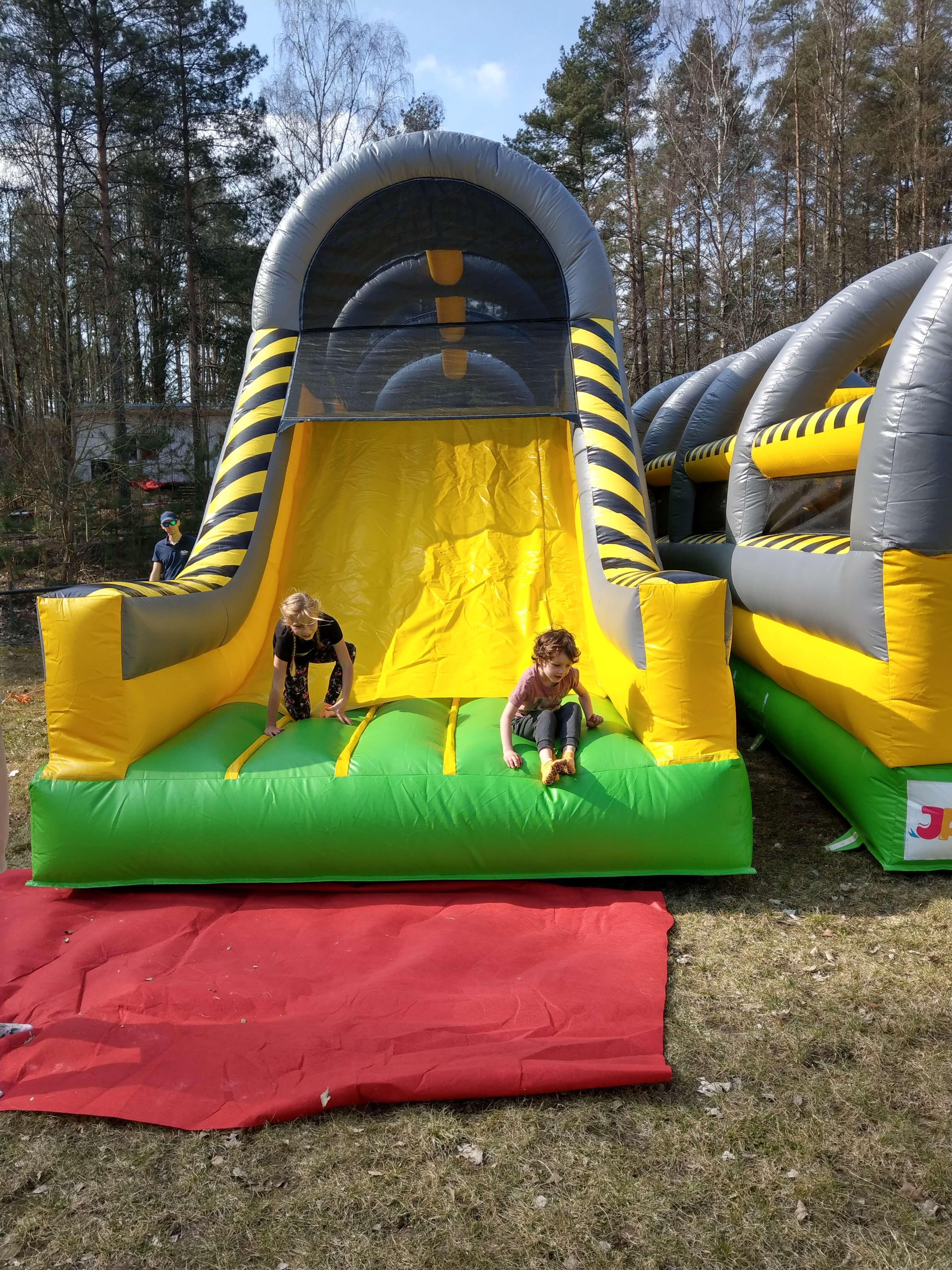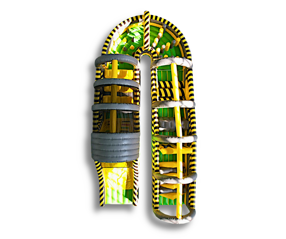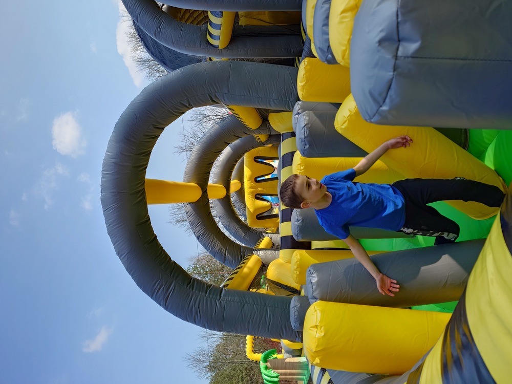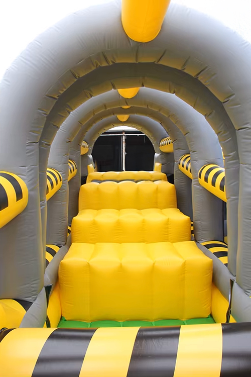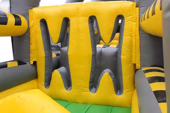 4. Zawiera m.in.: stojące dmuchane słupki, ściankę wspinaczkową, kule/beczki do skakania, zjeżdżalnię