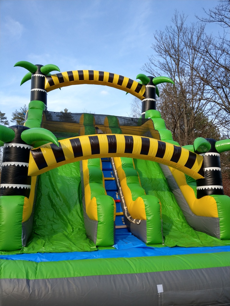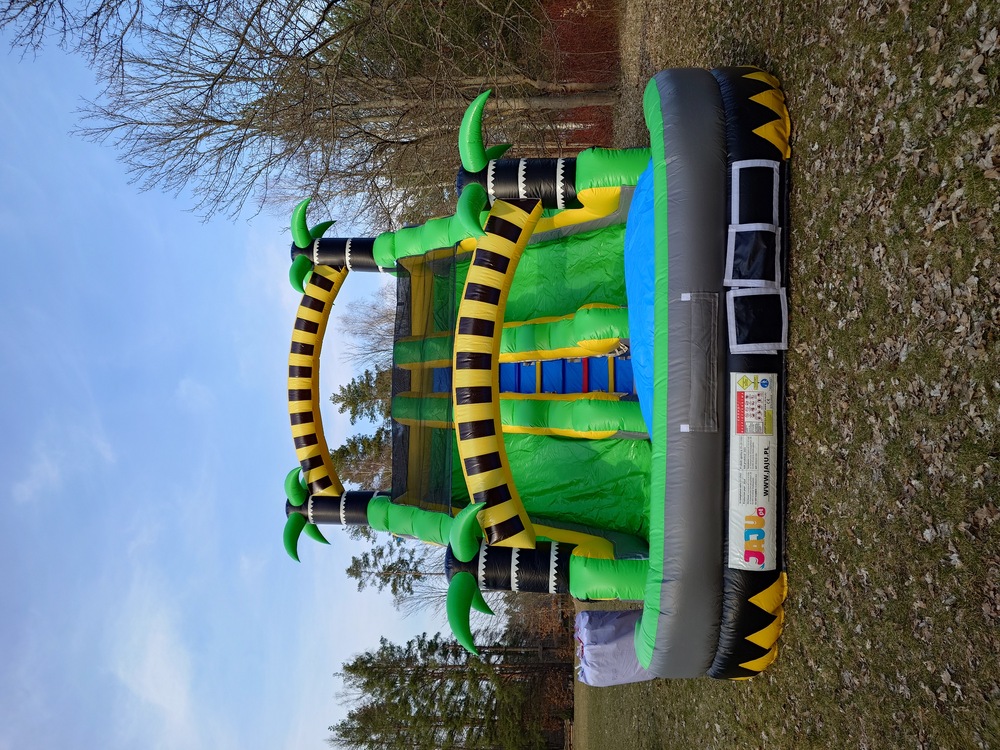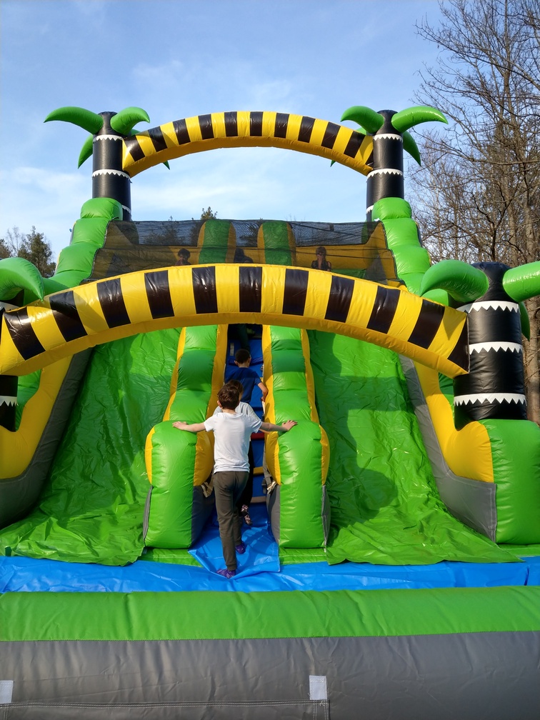 - trampolina wyposażona we wzmacniane D-Ringi o grubości 8mm zarówno w górnych partiach atrakcji jak i przy podłożu,